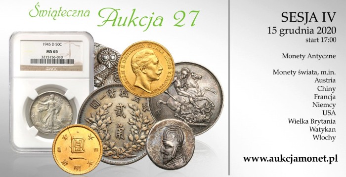 W dniach 12-15 grudnia 2020 roku (sobota-wtorek) odbędzie się Świąteczna Aukcja 27e Antykwariatu Numizmatycznego Michał Niemczyk, która składać się będzie z czterech sesji. Rozpoczęcie aukcji o godz. 9.00 (sesje I i II) oraz 17:00 (sesja III i IV). Będzie to aukcja internetowa (bez licytacji na sali). SESJA 1 (licytacja 12 grudnia, w sobotę) to przede wszystkim monety średniowieczne, monety Polski Królewskiej, Polski z okresu zaborów i monety Rosji. SESJA 2 (licytacja 13 grudnia, w niedzielę) to głównie monety II RP, PRL, monety kolekcjonerskie po 1990 roku i destrukty z okresu PRL i III RP. SESJA 3 (licytacja 14 grudnia, w poniedziałek) to literatura numizmatyczna, medale, monety spółdzielni wojskowych oraz banknoty polskie i ze świata. SESJA 4 (licytacja 15 grudnia, we wtorek) to monety antyczne i monety świata.