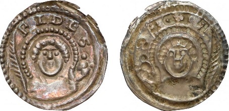 Piękny egzemplarz brakteata z napisem cnoty FIDES - wiara (ładniejszy od sztuki obecnej z zbiorach MNK). Datowany na 4 ćw. XII wieku, przypisywany niegdyś Henrykowi I Brodatemu.