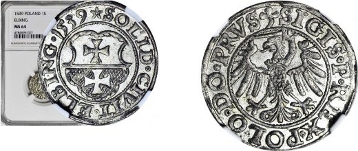 Perfekcyjny egzemplarz szeląga elbląskiego Zygmunta Starego, docenionego przez NGC najwyższą notą na świecie - MS64. Rewelacyjne detale, idealne, głębokie, centryczne bicie, Świetny połysk. OKAZOWY EGZEMPLARZ, OZDOBA ZBIORU.