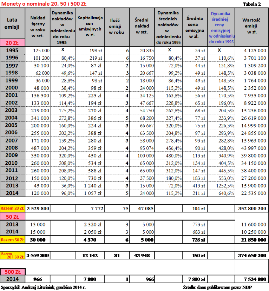 Następna tabela to emisja monet srebrnych o nominałach 20 i 50 złotych.