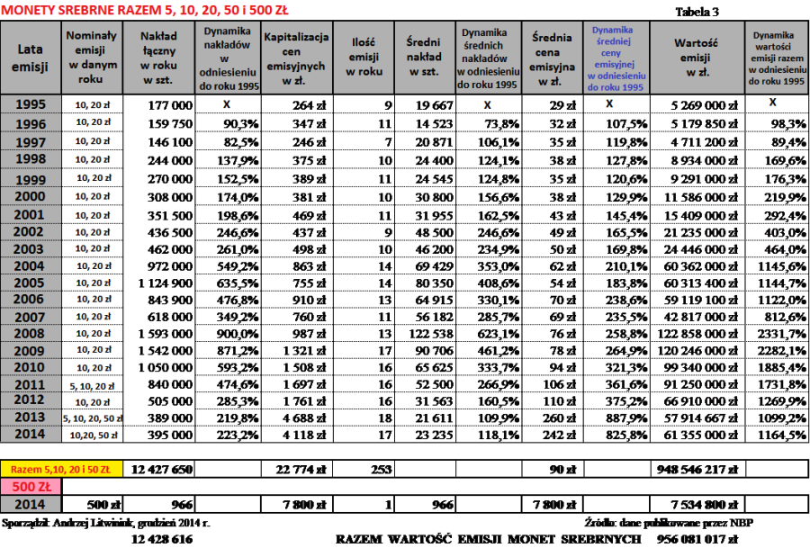 Trzecia tabela to zestawienie emisji wszystkich monet srebrnych.