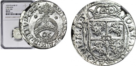 Jedyny egzemplarz na świecie w nocie MS, do tego ekstremalnie wysokiej - MS65. Wyśmienita moneta bez wytarć obiegiem z mocnym lustrem menniczym na całej powierzchni. W jabłku królewskim błędne oznaczenie nominału - 06 zamiast 60-ta część talara. Luksusowy egzemplarz do ekskluzywnych kolekcji.