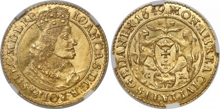 Wyśmienity egzemplarz dukata z pierwszego roku ich bicia za króla Jana Kazimierza.