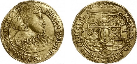 280 – Jerzy Wilhelm 1619-1640, dukat, 1639, mennica Królewiec; Awers: Popiersie władcy, bez nakrycia głowy, w prawo, GEORG WILH D G MAR BRA S R I ARCH C E E; Rewers: Ukoronowana dziewięciopolowa tarcza herbowa przedziela datę, pod tarczą litery D-K, MONE NOVA AUREA DUCIS PRUSSIÆ; Fr. 2186, Killisch 1086, Slg. Marienburg 9675; złoto, 3.44 g; moneta delikatnie podgięta, rzadka odmiana z odkrytą głową władcy (bez mitry).