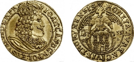 168 – Miasto Toruń, dukat 1655, Toruń; Awers: Popiersie króla z orderem Złotego Runa w prawo i napis wokoło IOAN CAS D G R POL ET SVEC M D L R PR, Rewers: Anioł trzymający kartusz z herbem Torunia, data 16-55 (data przebita z rocznika 1654) i litery H I - L po bokach, w otoku napis MONETA AVREA CIVIT THORVNENSIS; CNCT 1587 (R5), Fr. 60, H-Cz. 2064 (R4), Kaleniecki s. 439, Kop. 8351 (R5), Kurpiewski 1056 (R5), Tyszkiewicz 35 mk; złoto 3.49 g; na awersie zadrapania w tle, ale z ładnym połyskiem menniczym i pięknej prezencji. Dukaty z inicjałami HD-L wybijał Hans Dawid Lauer mincerz i administrator mennicy od roku 1649. W latach 1653 - 1655 pojawiły sie także z literami HI - L przy tarczy herbowej miasta, inicjałami należącymi do jego brata, Hansa Jakuba Lauera. Charakterystyczną cechą tych egzemplarzy jest trójkąt z gwiazdką w środku rozpoczynający napis w otoku na rewersie. Oferowany egzemplarz oznaczony jest właśnie inicjałami Hansa Jakuba.