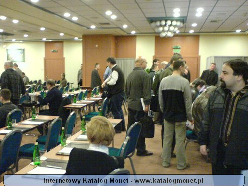 Uczestnicy powoli zajmują miejsca - na razie jeszcze wszyscy są na zewnątrz lub oglądają z bliska oferowane na aukcji monety
