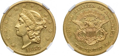 424 – 20 dolarów 1864, NGC AU DETAILS