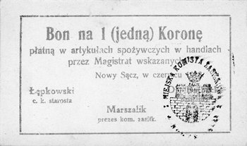 – Bony na 1 koronę (1918) płatne w artykułach spożywczych w handlach przez Magistrat wskazanych