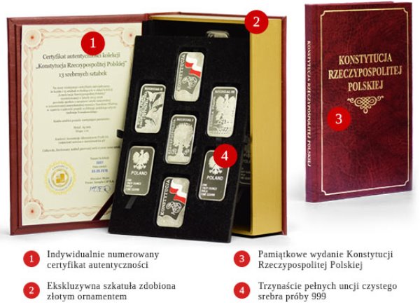 „Polska Konstytucja” to kolekcja trzynastu srebrnych sztabek zaprojektowanych przez wybitną polską artystkę Roussankę Nowakowską. Każda ze sztabek ma wagę 1 uncji, cała kolekcja w sumie waży niemalże pół kilograma. Kolejne sztabki, począwszy od maja br., będą się ukazywać raz w miesiącu. Nabyć je można w subskrypcji, która gwarantuje stałe ceny sztabek w wysokości 249,00 zł – sztabki 2-13 oraz 199,00 zł – pierwsza sztabka. Wraz z subskrypcją każdy kupujący otrzyma również ekskluzywną szkatułę, egzemplarz Konstytucji III RP w pięknej oprawie oraz certyfikat autentyczności.