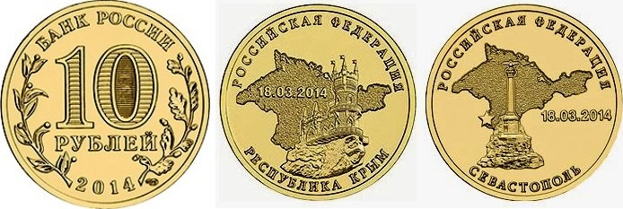 Centralny Bank Rosji w ramach serii „Federacja Rosyjska” wyemitował dwie monety o charakterze obiegowych monet pamiątkowych prezentujące Krym. Obie wybito w 10-milionowym nakładzie. Na monetach umieszczono kontury Półwyspu Krymskiego, datę „18.03.2014”, napisy „РОССИЙСКАЯ ФЕДЕРАЦИЯ” (ROSJA) wzdłuż obwodu na górze i na dole „РЕСПУБЛИКА КРЫМ” (Republika Krym) – na pierwszej monecie lub „СЕВАСТОПОЛЬ” (Sewastopol) – na drugiej monecie. Na tle mapy Krymu umieszczono wizerunki: zamek „Jaskółcze Gniazdo” położony na skale Aj-Todor w miejscowości Haspra koło Jałty – pierwsza moneta i pomnik „Zatopione statki" w Sewastopolu – druga moneta. Średnica monet – 22 mm.