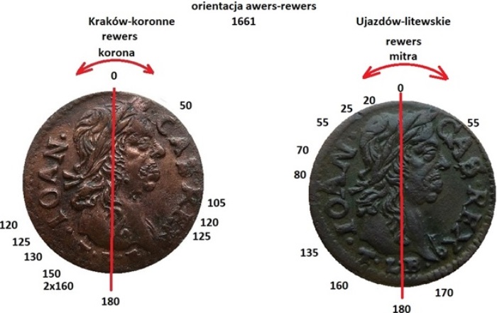 Zasadniczym powodem, dla którego wątpiłem w autentyczność menniczego egzemplarza aż do 2021 roku i obecnie te wątpliwości wróciły jest rzymska cyfra I w dacie. Mennica krakowska miała kontrakt tylko na bicie monet koronnych. Nie miała prawa wybijać monet litewskich. Mogła tylko przygotować stemple dla mennicy w Ujazdowie, która miała kontrakt na bicie monet litewskich. Istnieją dowody, że przynajmniej dwukrotnie w mennicy krakowskiej wykonano takie stemple, raz w 1660 stemple rewersów koronnych i drugi raz w 1661 stemple awersów. Natomiast stempel rewersu boratynki litewskiej z rzymską cyfrą I w dacie nie powinien powstać. Przypomnę, że rzymska cyfra I w dacie była immanentną cechą mennicy krakowskiej. Z wyjątkiem tych trzech monet nie ma innych z rzymską cyfrą I w całej emisji ujazdowskiej. Co to za wzorzec, którego się nie powiela? Ani w zakresie daty ani w zakresie ułożenia awersu względem rewersu. Jeśli to miały być monety wzorcowe, to dlaczego nie wybito ich z datą ujazdowską, tak jak poniżej na monecie po prawej stronie?