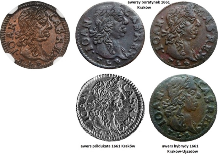 Podobnych różnic jest więcej. Wniosek jest taki, że to zupełnie nowy portret, nigdy wczesniej ani później nie stosowany w Krakowie. Dlaczego został wykonany? Przecież w mennicy krakowskiej było przynajmniej kilka punc tego portretu. Można było wykorzystać jedną z istniejących. Rysuje się dosyć dziwna chronologia. Na zestawieniu 1- jedna z punc portretowych wykorzystywana w mennicy krakowskiej w 1661 roku, 2- punca portretowa specjalnie przygotowana dla monet okazowych?, 3- punca krakowska wykorzystana na awersie monet hybrydowych w Ujazdowie. Dlaczego nie wykorzystano tej nowej?