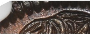 Zdjęcie aukcyjne jest rozjaśnione. Moneta w rzeczywistości jest ciemniejsza o czym świadczy zdjęcie ze strony NGC. Jak widać zdjęcie monety z katalogu zostało poprawione dając złudzenie gabinetowej patyny. Proszę zwrócić uwagę na oś ułożenia rewersu względem awersu. Moneta jest w slabie i nie można sprawdzić jej wagi, średnicy, jak wygląda rant i ewentualnie składu stopu miedzi. Zdecydowałem porównać osie pozostałych dwóch egzemplarzy. Ku mojemu zdumieniu wszystkie trzy monety mają taka samą oś ułożenia awersu i rewersu. Pamiętamy, jak wyglądało bicie ręczne monet. W drewniany pieniek wbity był stempel dolny z awersem monety. Na ten stempel pomocnik mincerza kładł czysty krążek. Mincerz przykładał do krążka stempel górny i uderzał w stempel młotkiem odbijając monetę. Zwykle układano stempel górny w pośpiechu i na bitych monetach oś awers-rewers jest przypadkowa. Częste są niedobicia, przesunięcia stempla na krążku. Taka jest uroda monet bitych ręcznie.